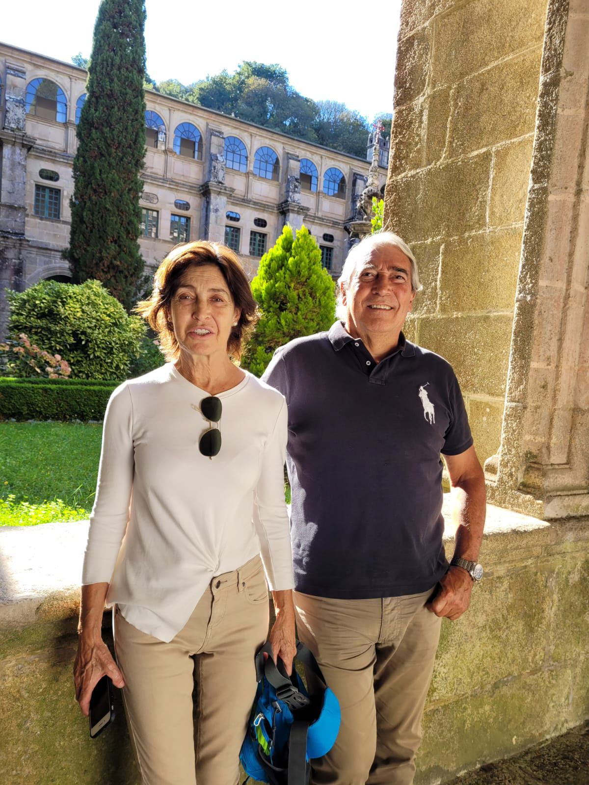 El puente de A Áspera saliendo de Sarria y la portada de la Iglesia de Santiago en Barbadelo (Iñaki observa uno de los primeros sellos)