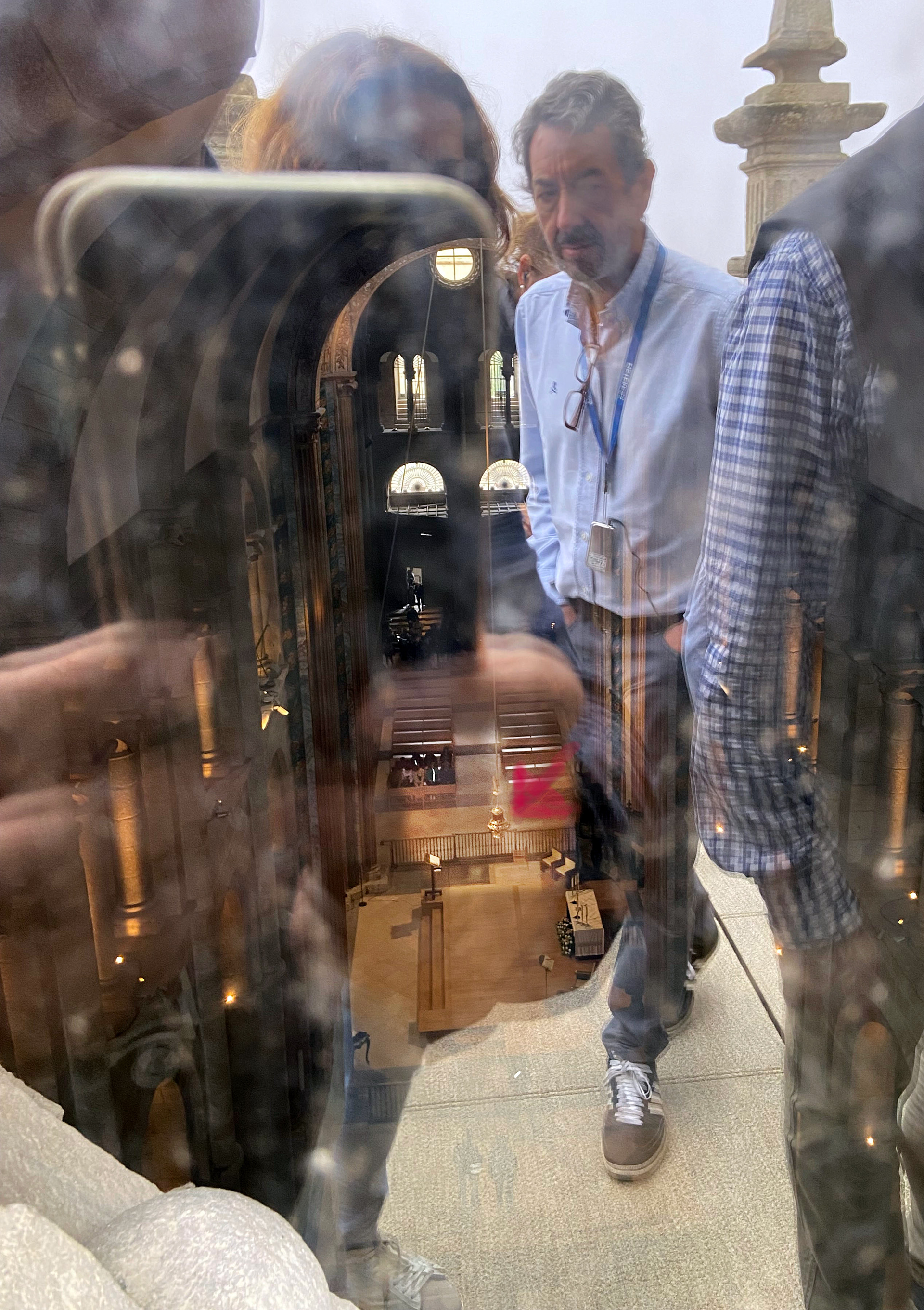 Vista del Transepto desde la cubierta de la Catedral. Entre los reflejos en el cristal del lucernario se aprecia el Botafumeiro colgado sobre el Crucero.